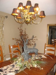 Then I remembered what a girlfriend did to her light fixture.  So I set out to get lampshades to go on my “gold” light fixture.  What a difference a lampshade can make.  I needed 15 of them and it came to a little over $100.  But, when I put all 15 of them on it looked a little “lampshady”. The light was very romantic, but my grandkids and son-in-laws don’t go for the romantic look at our family dinners.  So I removed 5 of the shades in the center row and it looked great and gave out a lot more light than it has with all 15 shades on them.
