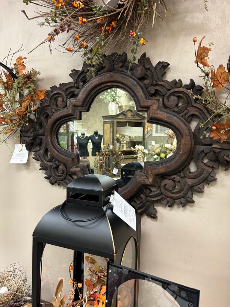 Another thing that I purchased to sell because of its’ antiquity was this mirror, but also even now it is timeless. Even in a contemporary home, I think it would add an element of surprise to the perfect spot as well as an interest of the unexpected. I loved this mirror when I saw it and knew it had to come to the shop with me. Actually, I purchased it at the same time I purchased the chairs. And talk about labor intensive, it was all hand carved.
