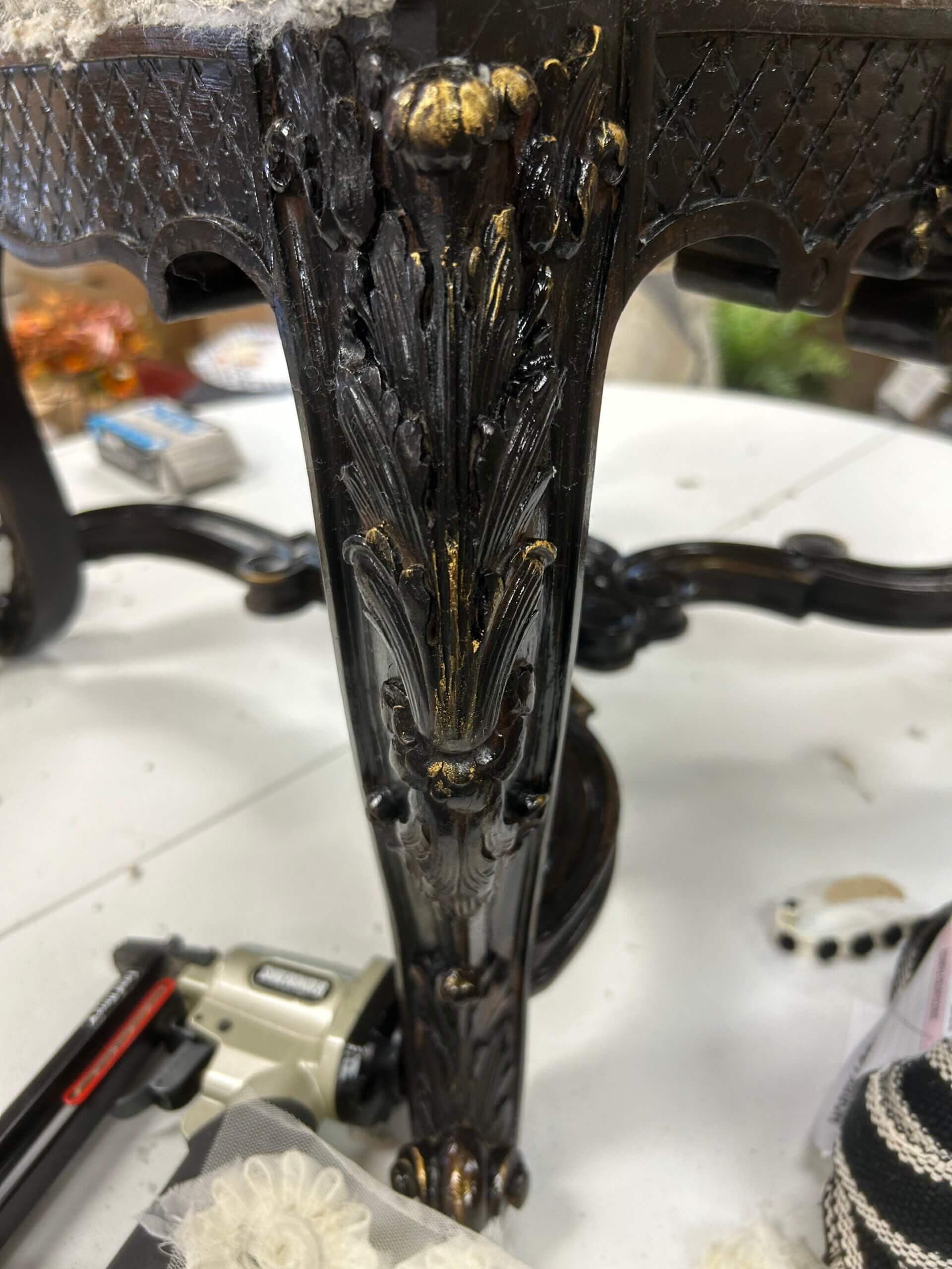 This is a chair I’ve been working on as well this week and I think I’m going to love it. I stained it black and then used gold leaf on the design. When my husband took it apart, I realized this is really an old piece. The thing weighs a ton because of the ornate carving. I love it. But I didn’t want it to look just the normal run-of-the-mill reupholster job. I wanted to have some character. Maybe a little whimsy. So I’m working on the whimsy this week. Some may like it, others may not. Isn’t that the way life is?