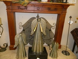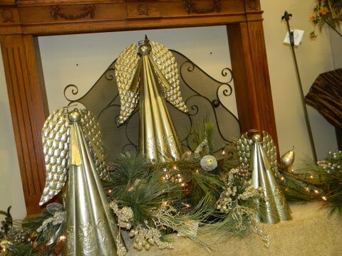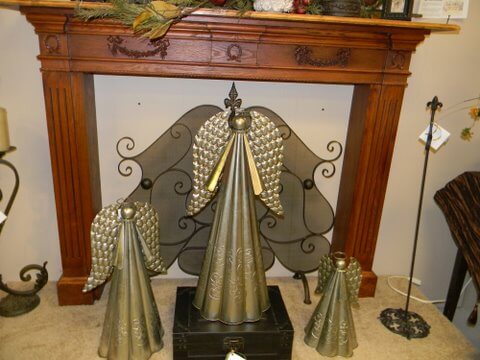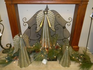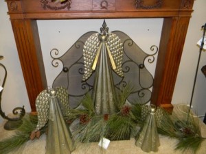 Let’s start with these new angels we got in. I fell in love with them at market. Just sitting alone on the hearth made these little angels look like they needed a cloud to float on. So here we go. I took one of the beautiful new garlands (these are a great price) and strung it through the dresses of the angels. (Excuse me, boy angels. They just look like dresses to me. I guess the correct term should be their robes.)
