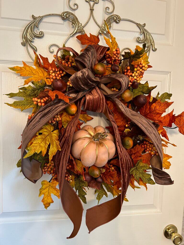 Also, I know it’s kind of my thing, if you will, to do a lot of florals. This year, I’ve done something really different and look forward to making it different for each of the seasons. This hanging wreath can be switched out for all seasons and I had so much fun making it. My husband made the stand and I think he took on the challenge quite well.