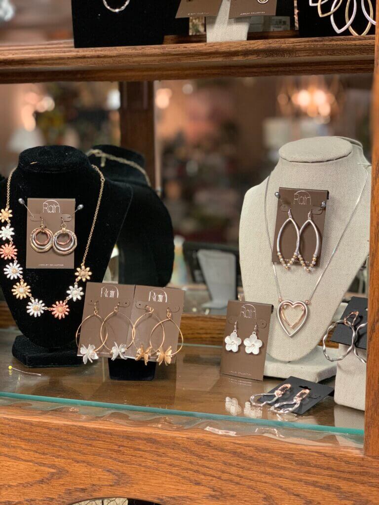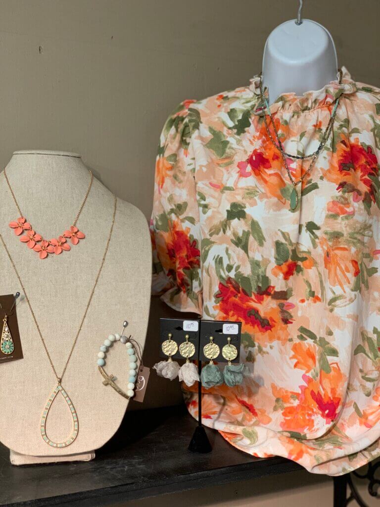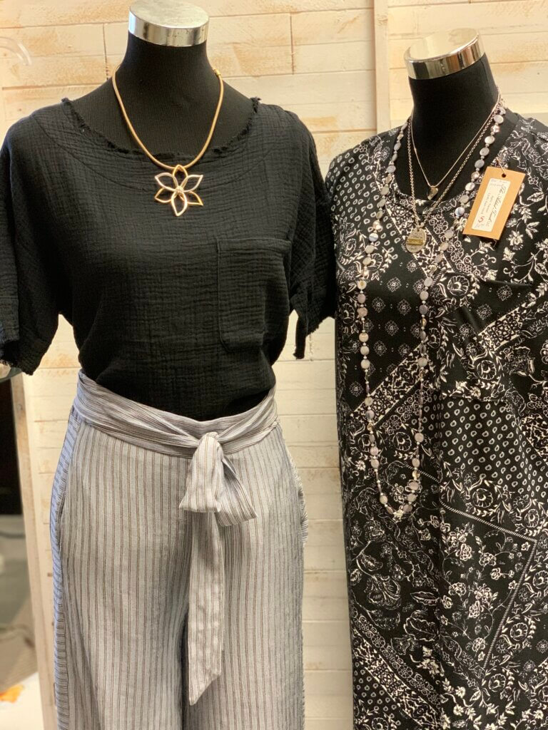 And, to some of you, I know that “happy” simply means comfortable, easy to wear. So for you all, I have a couple of no-iron, no-cling, dresses that are longer, loose fitting, and can be worn with a cute kimono, jean jacket, and even tennis shoes. Along with that easy to wear idea, I brought in a lot of new jewelry that mixes metals or is neutral enough to be worn with just about anything.
