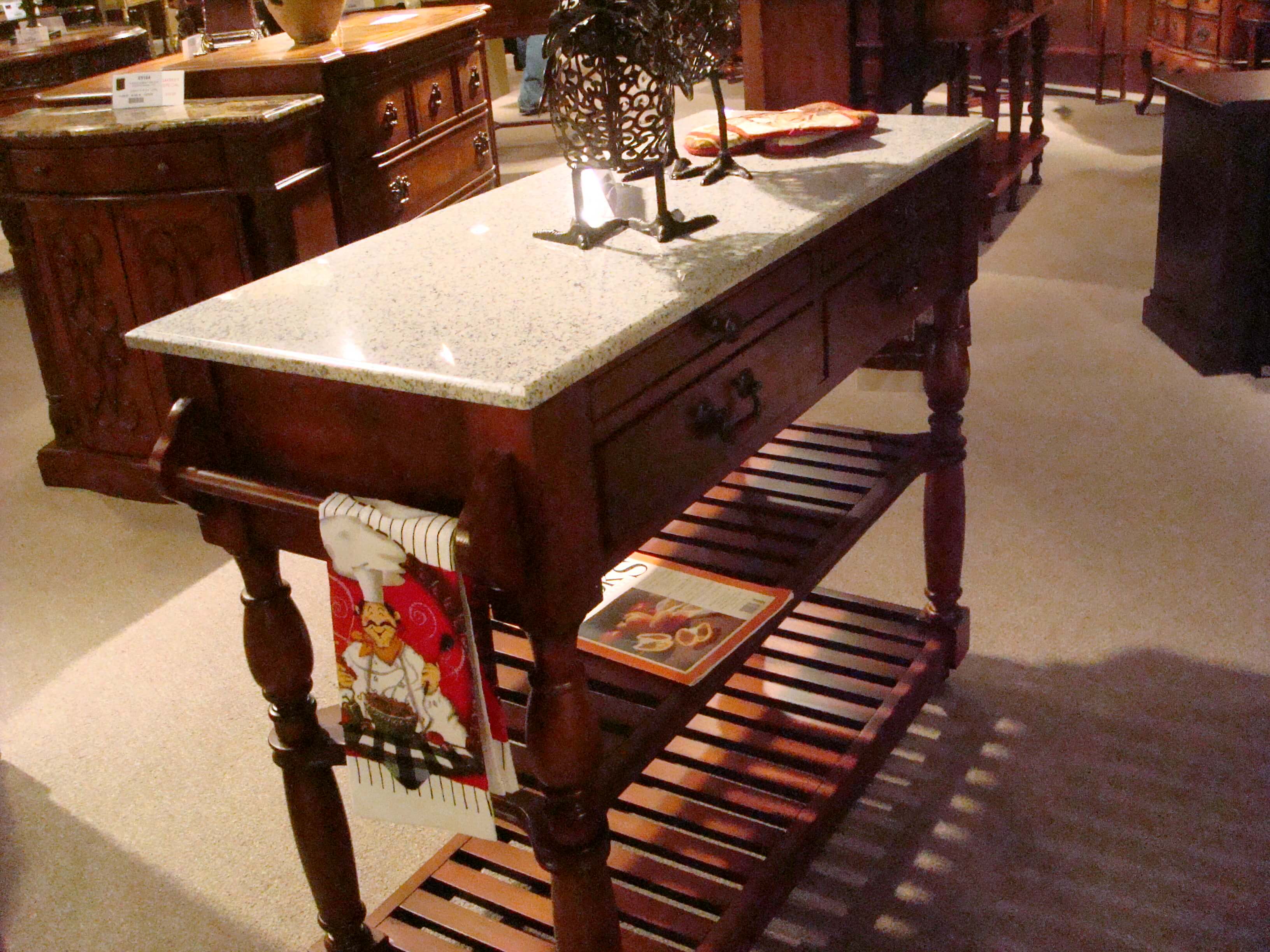 Just wanted you to see the new butcher table we’re getting in.  (It hasn’t arrived yet)  It’s got this great granite (or marble top, I don’t remember for sure) on top.  April is going to have it displayed with all the yummy Wind and Willow products.  I don’t know what you’ll want more–the Wind and Willow or the butcher table for your kitchen.
