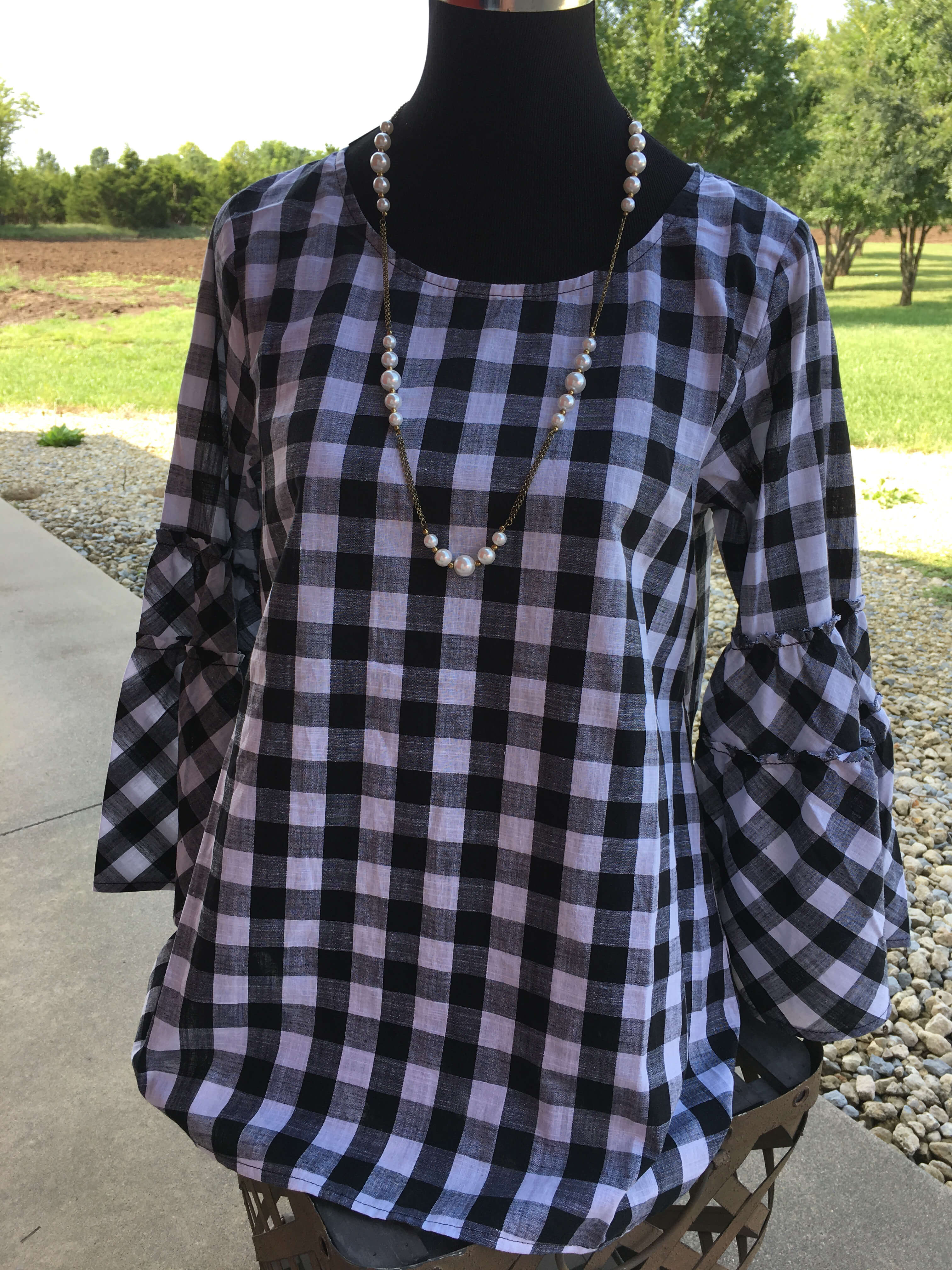 The polka dot speaks for itself and is a fun all season dress. The striped tunic is a longer length with a slight flounce on the side which hangs just beautifully. I always love a good black and white check. (I have several versions of this combination coming at different times this season, just because I couldn’t say “No” to them when I was ordering.)