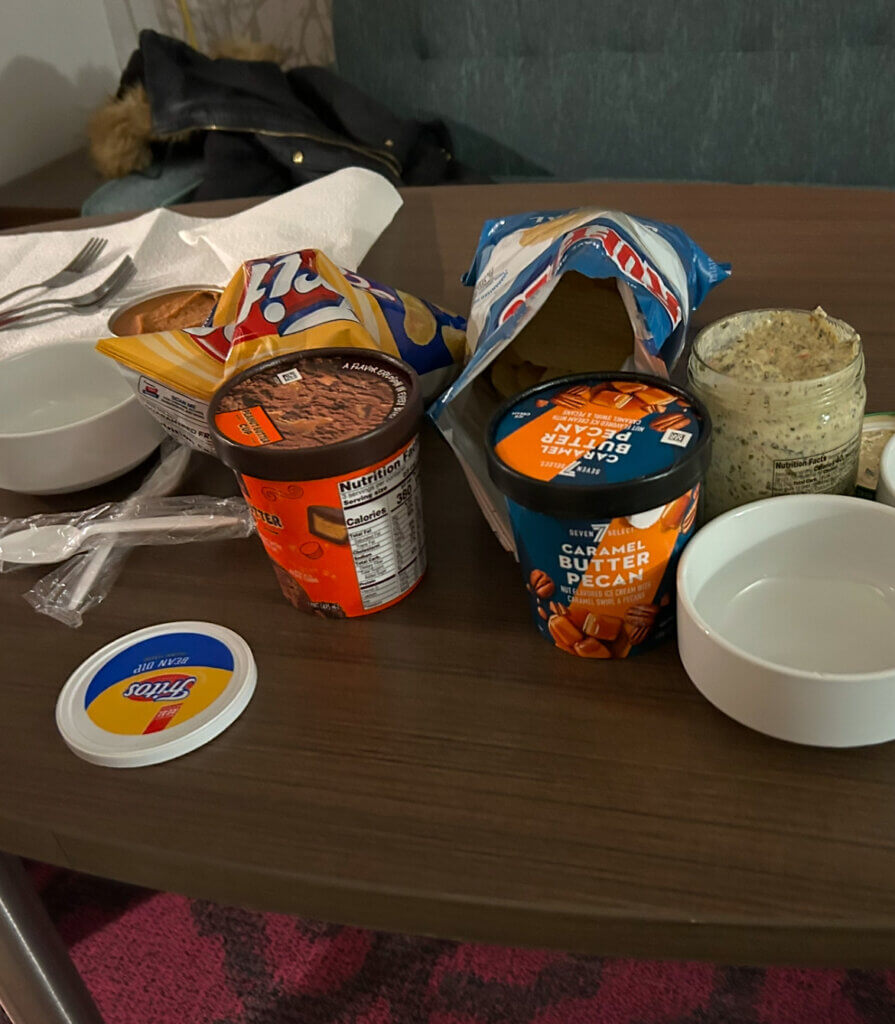 But the local 7-11 market saved our day. It was great to eat bean dip, spinach dip, and corn and potato chips. But the greatest part of all was the ice cream for dessert.