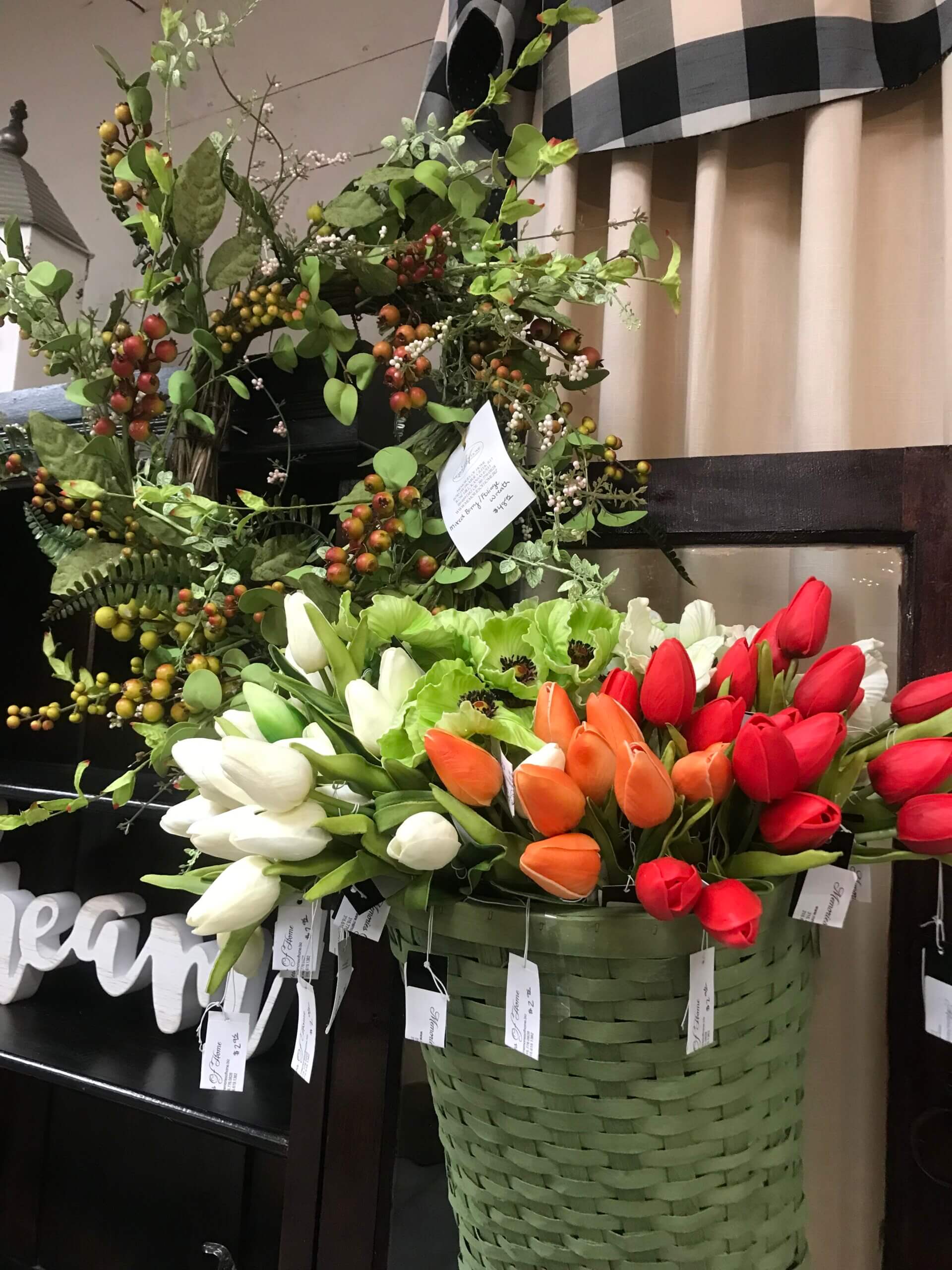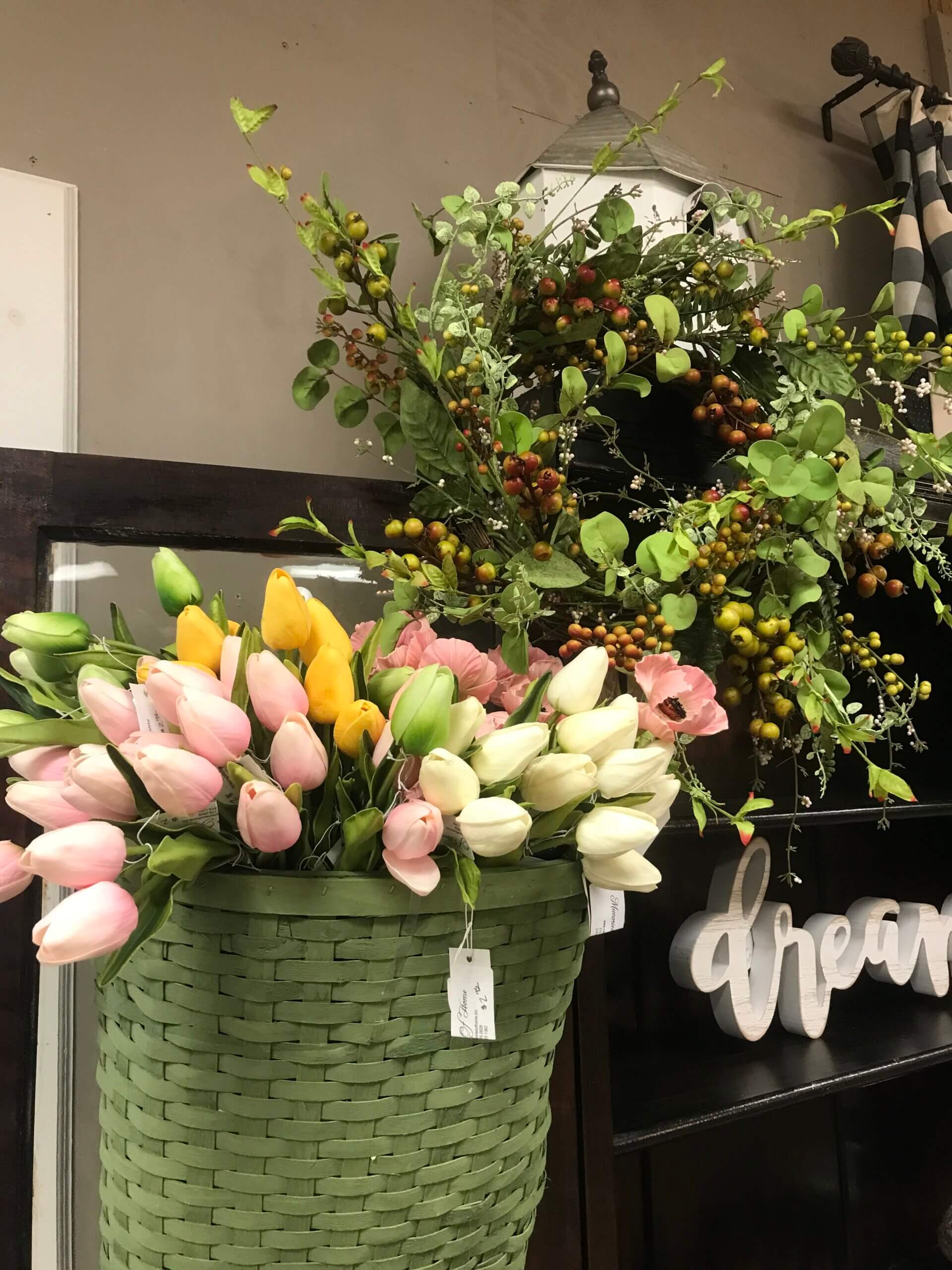 Did I tell you about the great sales we’re having during our Galentine Event – February 9,10 and 11? Who can resist beautiful flowers especially when they are buy one, get one FREE. Yep, that’s not a misprint. You’ll get one free with the purchase of one at the regular price. And the tulips abound in this place. As you look around you’d think it was the first of May with all the lifelike flowers we have scattered throughout the shop.