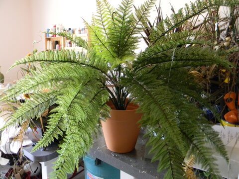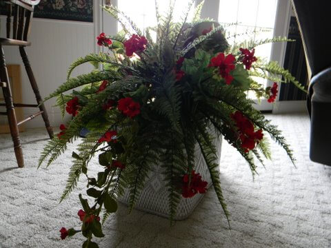 The next step was to get a clay pot and add floral foam to it. I put the strong foam in it and glued it in with Liquid Nails. (Do you know what the wind is like out in the country in Kansas?) Then I remembered I had a wonderful fern out in the shop that would fill this BIG basket.