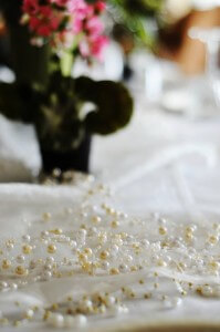 Then came the table. The white tablecloth was like an empty canvass waiting to be filled. I used a white chair tie as the center table runner. I loved the pearls at the end which led me to use two strands of bead garland on top of the runner.