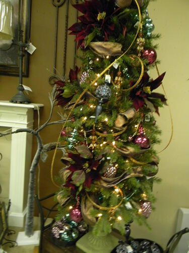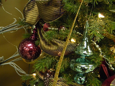 So, when we went to market this year, we looked for decorations that were unique and could be easily inserted into your existing color schemes. We have brought in shades of purple, blue, brown, pewter, and more for your tree. Some ornaments are shiny, some matte. They all vary in size and are uniquely shaped. We have also brought in items of texture for you to add to your tree. On this tree in the showroom, we have added flower stems, berries, textured ribbon, feathers and more.