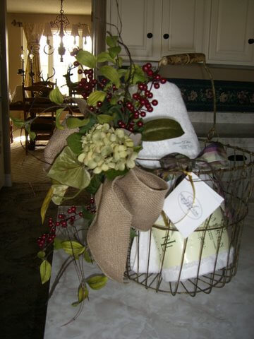 We all love interesting baskets, but what do we do with them?   Well, here’s an idea.  I decorated this basket with berries and added a towel with a ribbon around it.  (The ribbon tells your kids and husband, that this is for “show”.  My family always needs a little help with that.)  The burlap ribbon gives it an “organic” look.  The whole ensemble is so calming.  Makes you feel like you just came in from the garden.