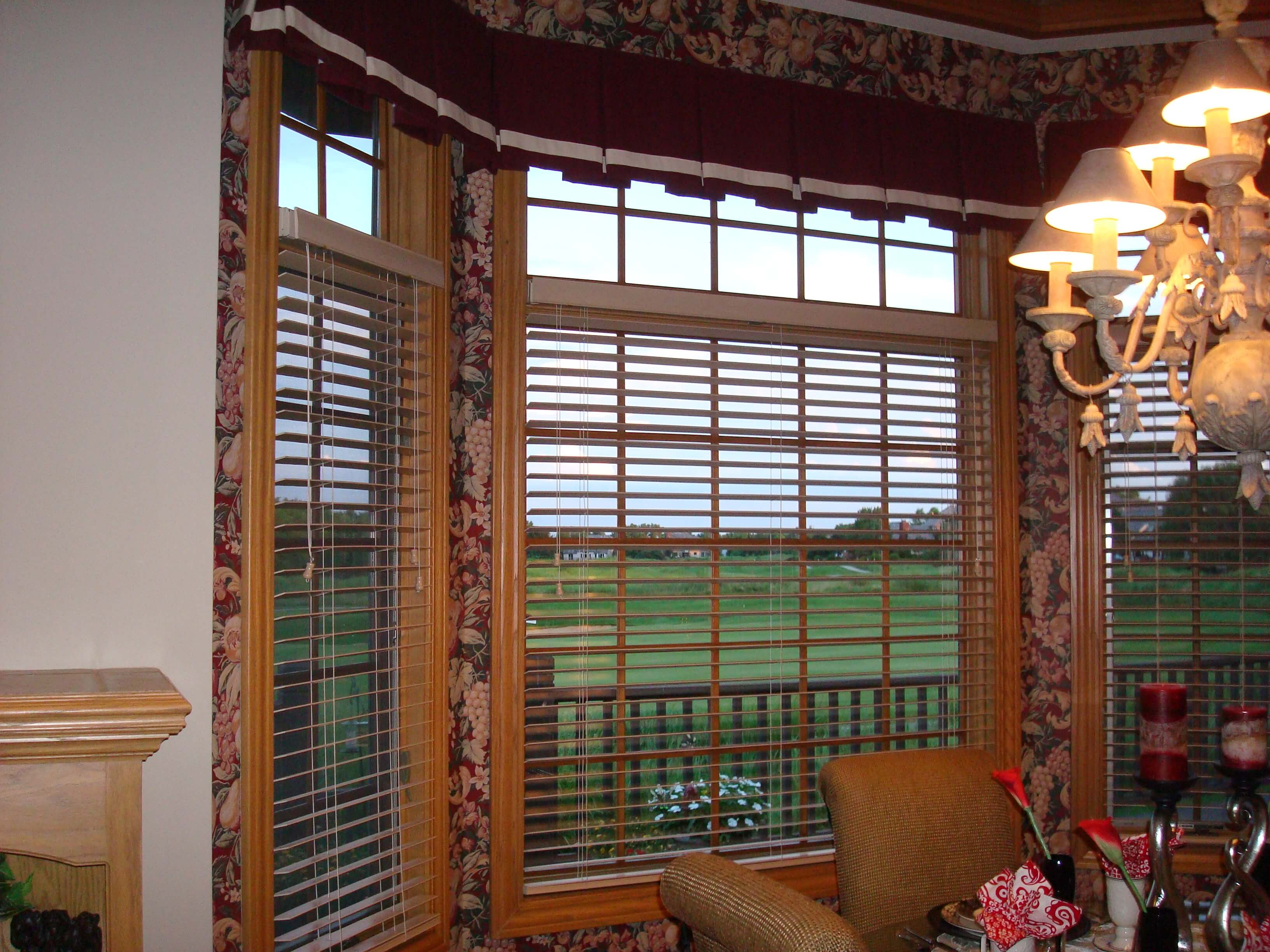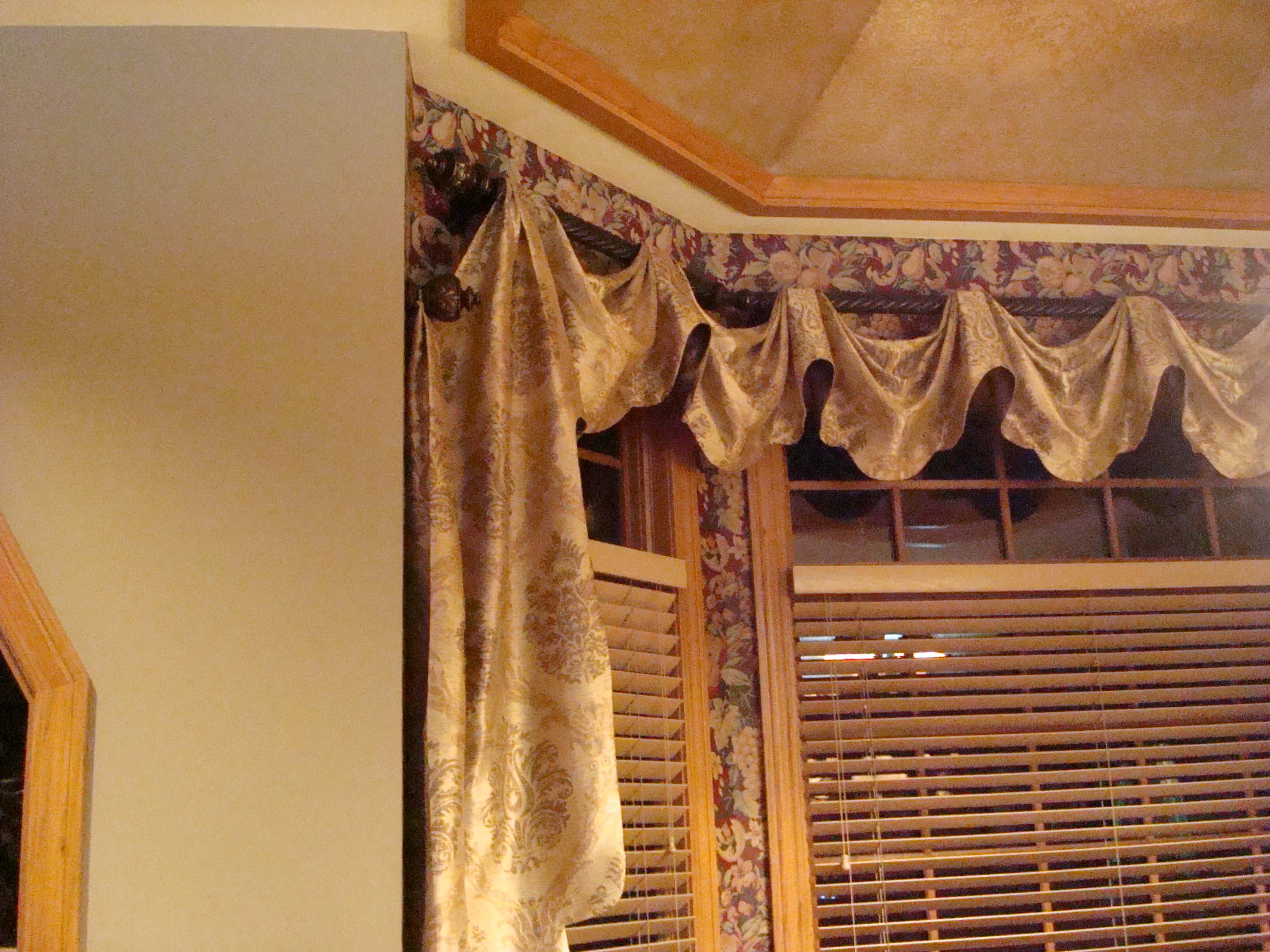 One of our longtime clients decided to finally tackle the windows in her kitchen/hearth room. The curtains came with the house 13 years ago. They were nice, custom made valances and matched the color scheme. So, the home owner had kept them, but all along knew they weren’t her real style. After redecorating many other rooms, which Memories of Home and The Added Touch were honored to assist with, it became clear that these curtains had to go.